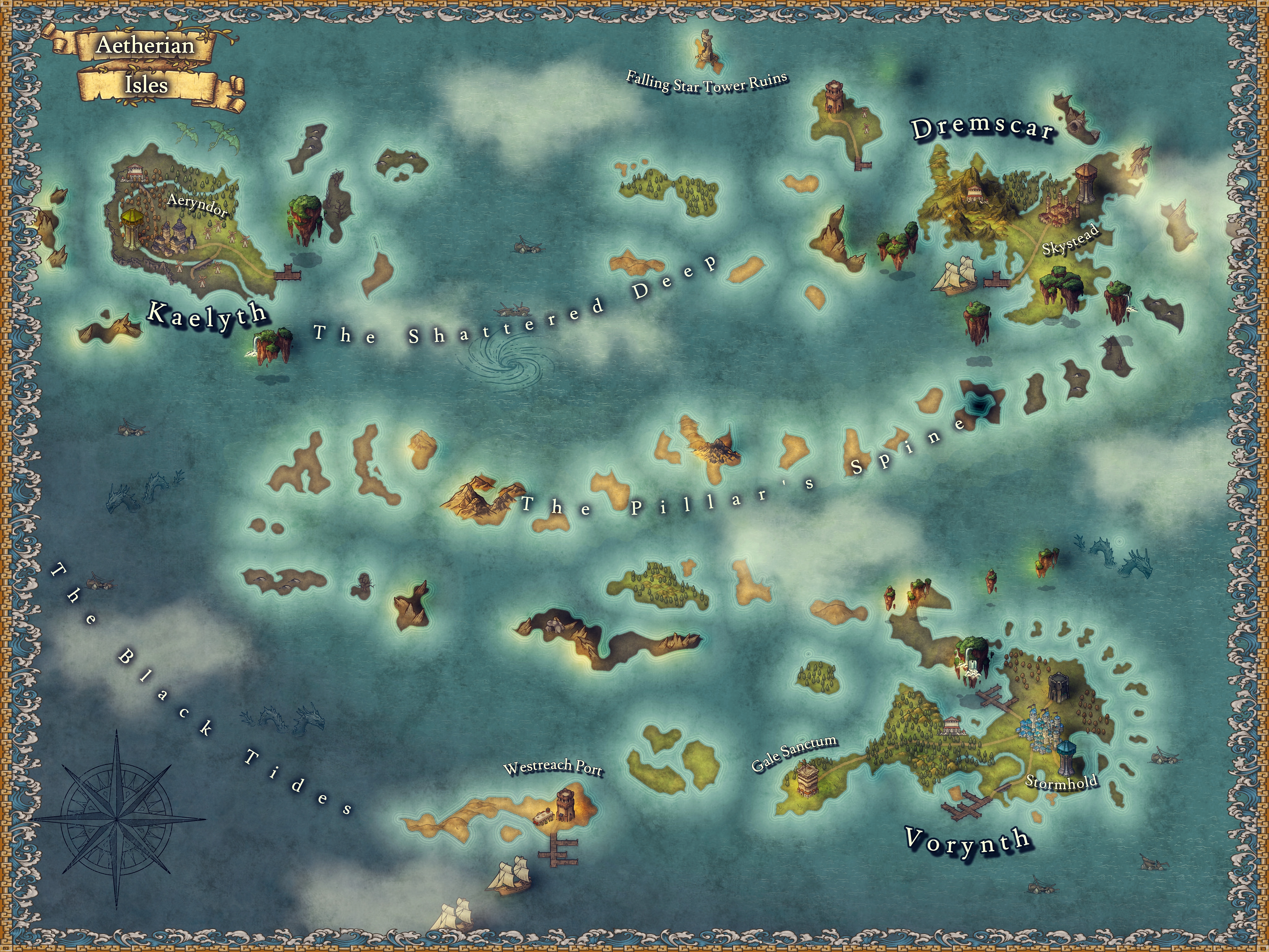 Airship lanes between main islands; ferries risk the Black Tides; cliff lifts link docks to sky farms.